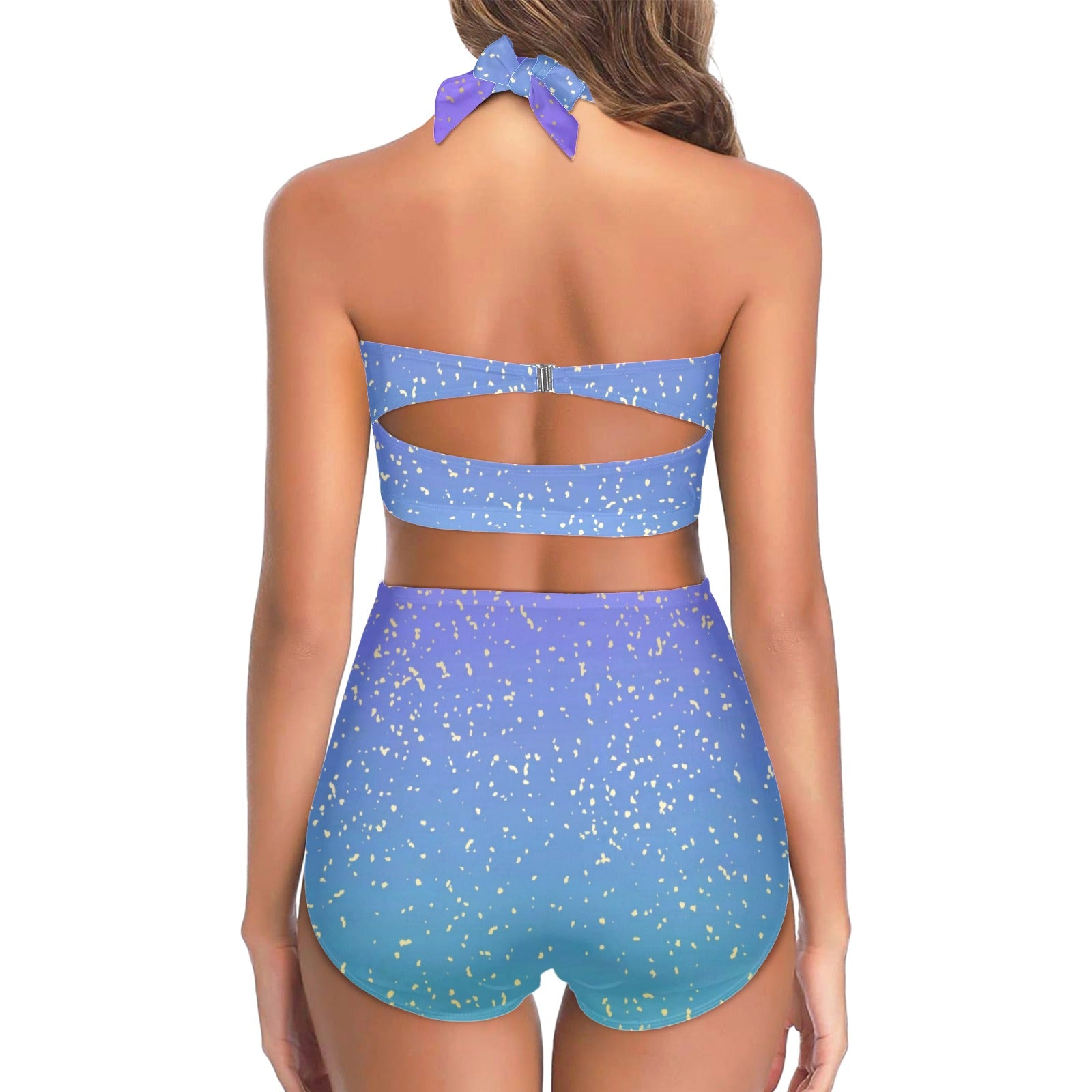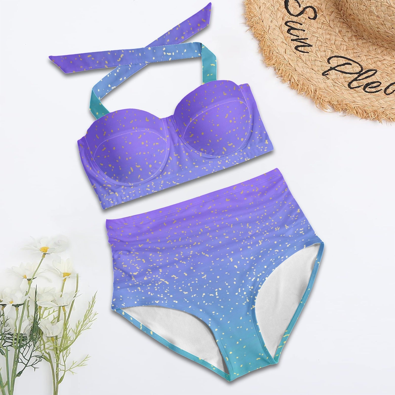 purple-blue gradient womens 2 piece swimwear Women's Halter Neck Gather Chest Bikini Swimsuit