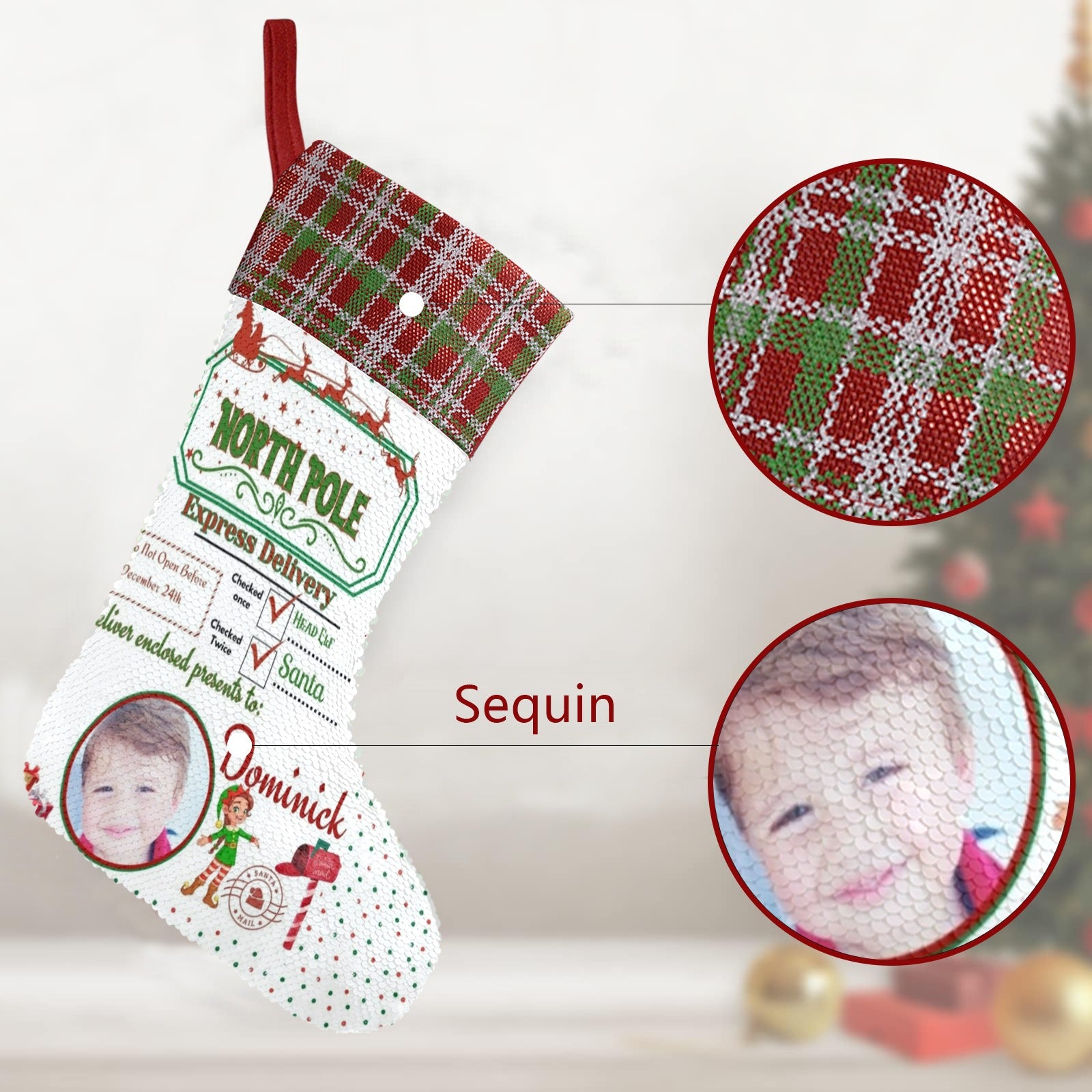Add Custom Christmas design element, greeting and photo to this stocking as a Christmas gift or hang it on the wall and Christmas tree as your unique holiday decor. This stocking will be a great Christmas gift idea in the