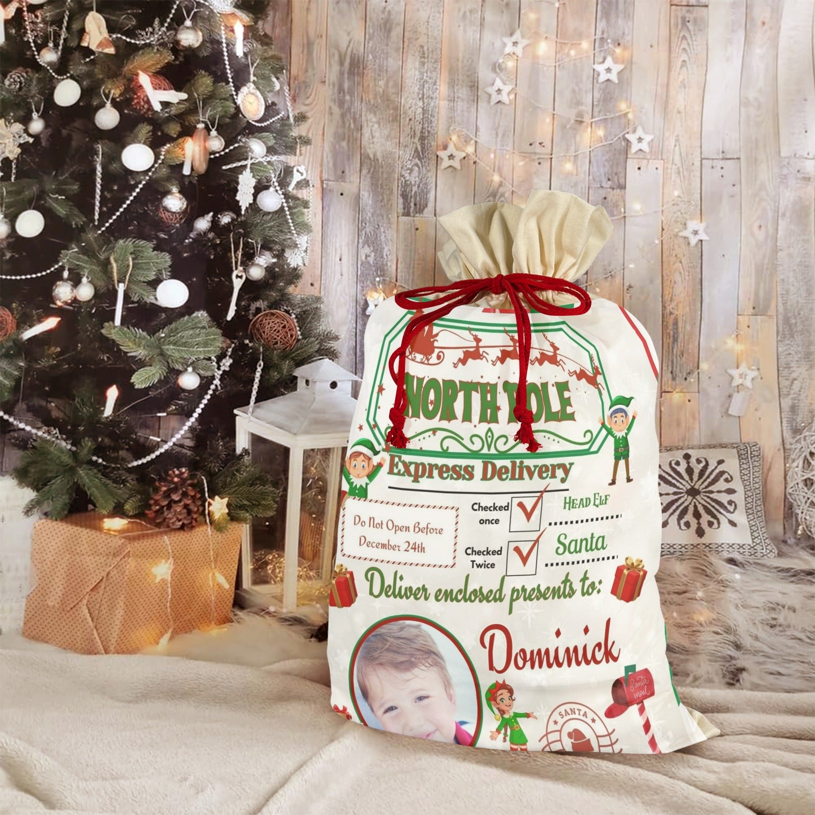 Great gift bag for Christmas lover or Special Christmas for your child. Customize to Add Christmas design element, greeting, and child's photo to this bag as a Christmas gift or hang it on the wall as your unique holiday decor.