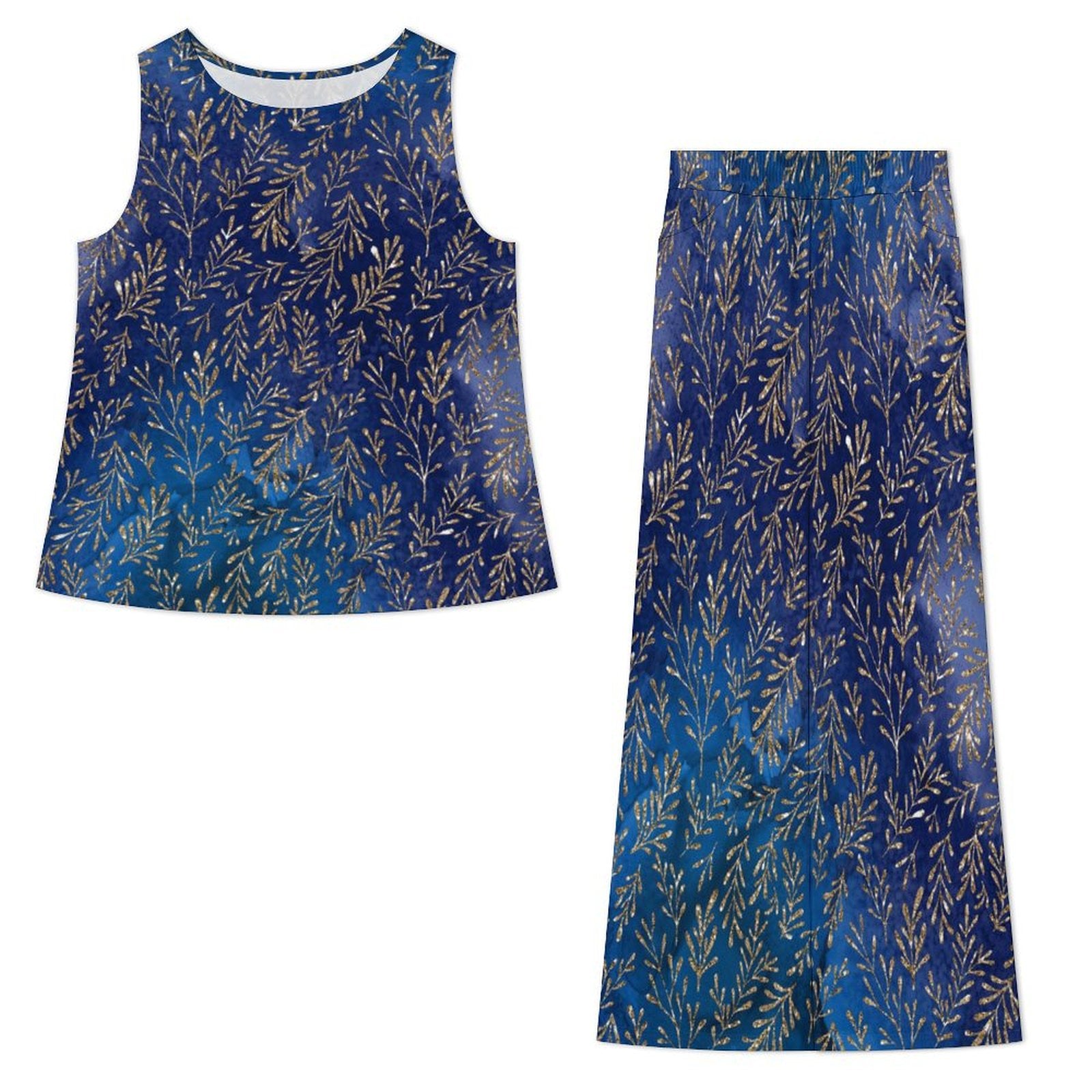 • Two-piece set, Round neck sleeveless top, high waist wide legged pants.